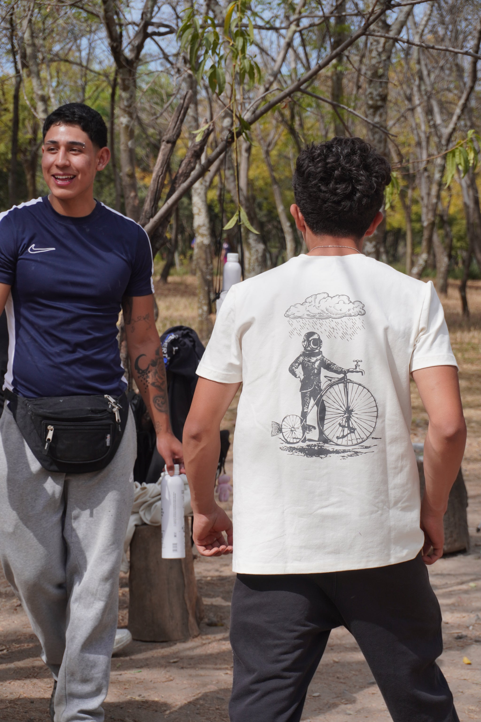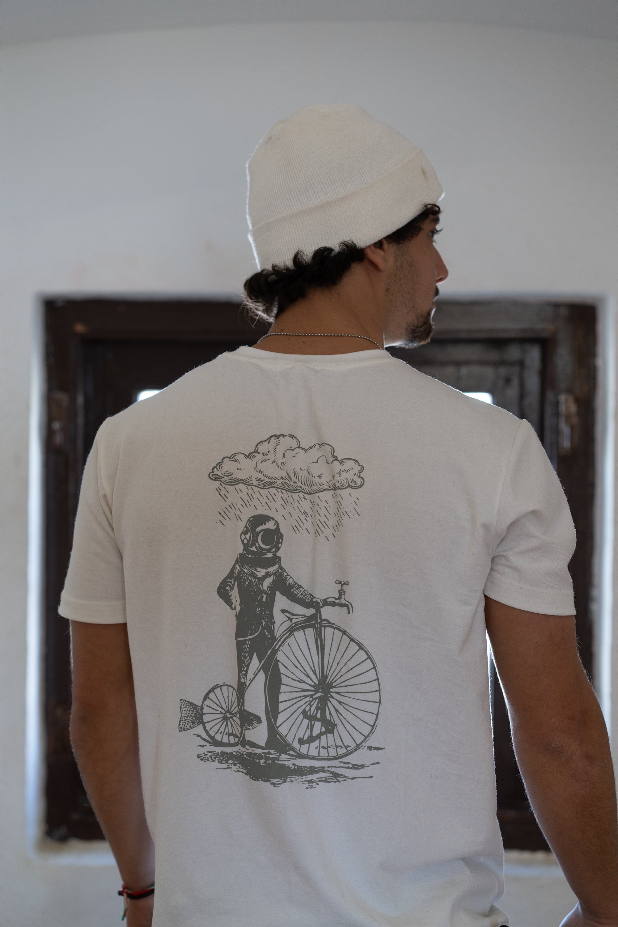 Playera de tela premium con artes inspirados en el universo visual de Casa del Agua: una expresión atemporal de la conexión entre hombre, máquina y naturaleza.